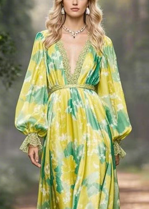 Green Print Oversized Chiffon Long Dress V Neck Spring