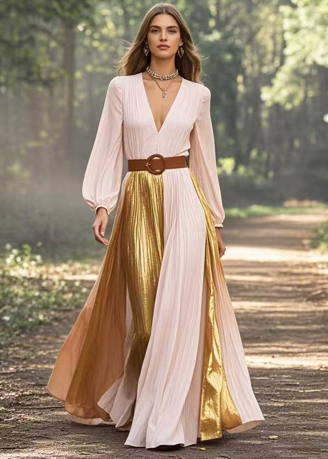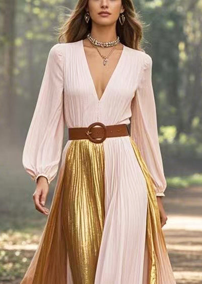 Boho Gradient Color V Neck Wrinkled Chiffon Long Dress Spring
