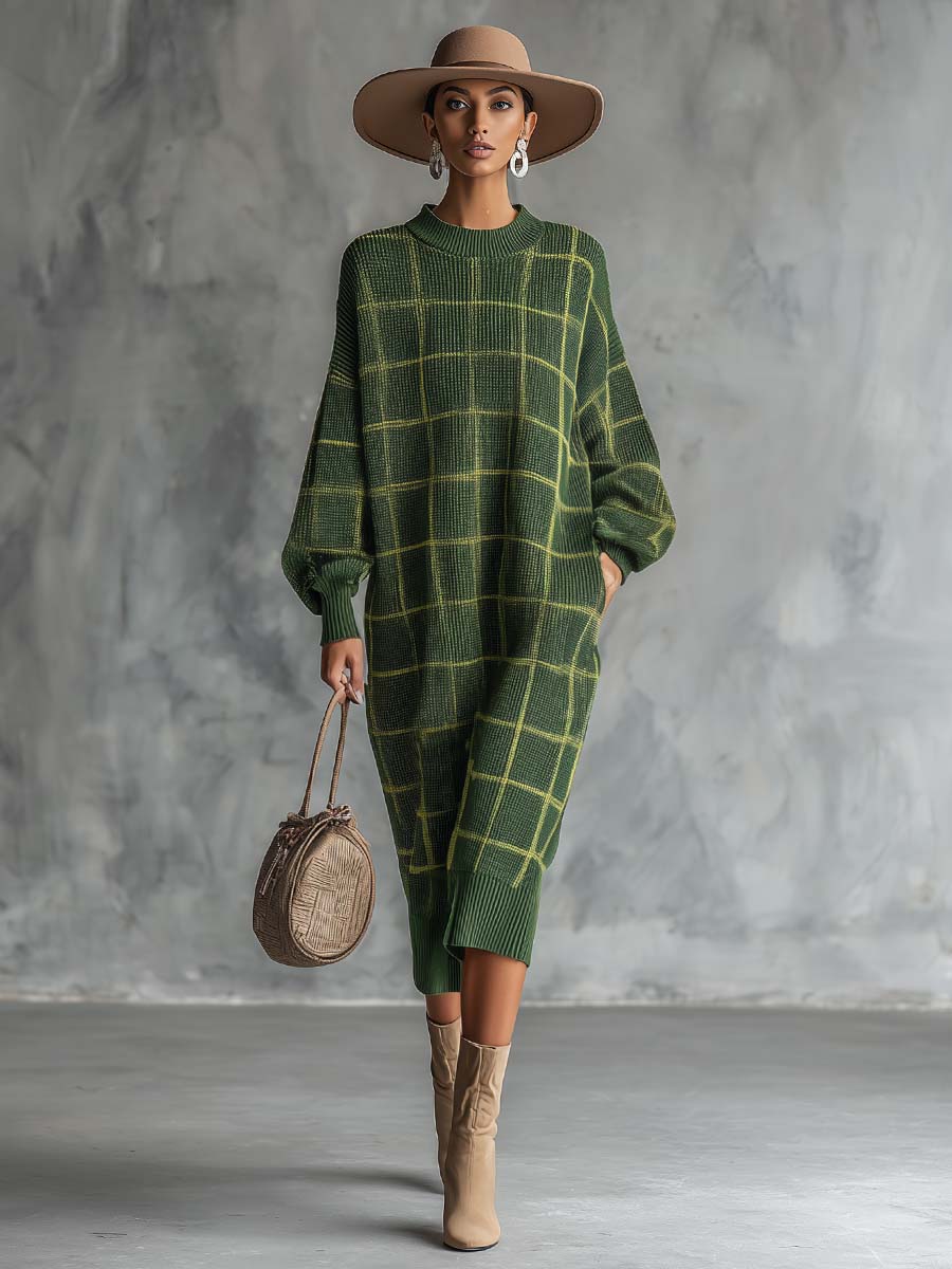 Retro Fashion Comfortable Loose-fitting Crew Neck Green Plaid Knit Midi Dress