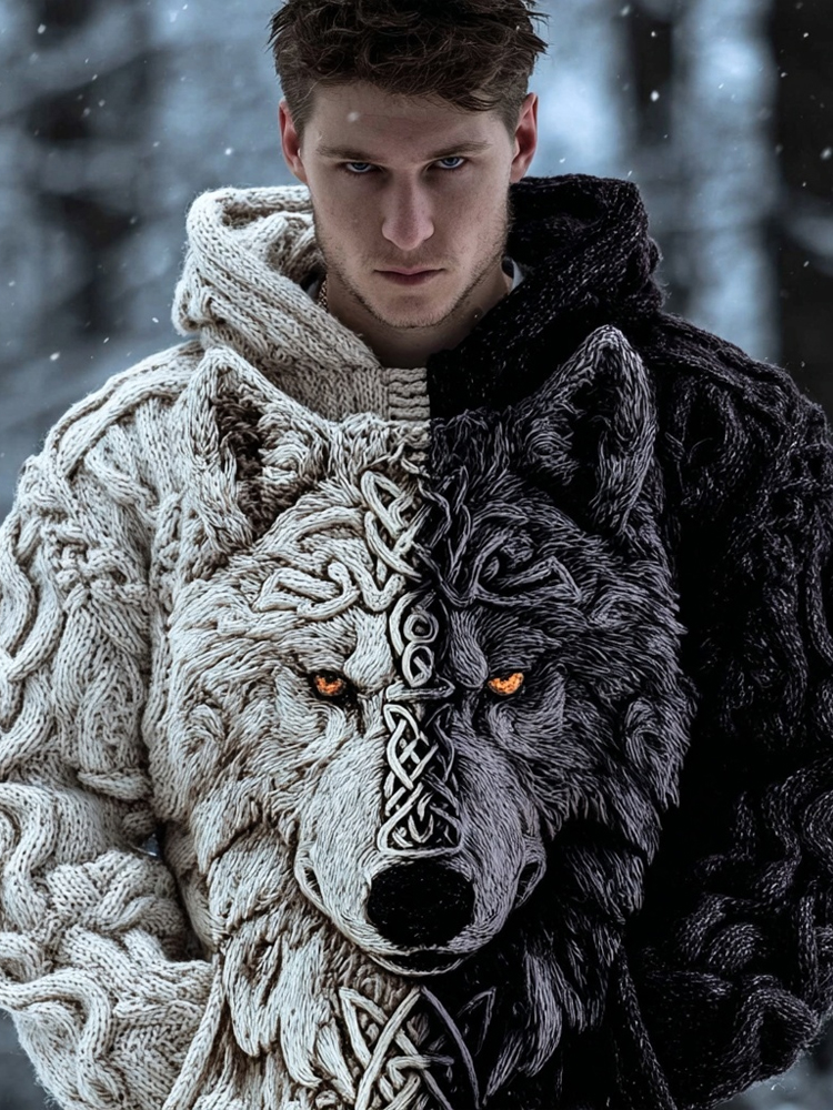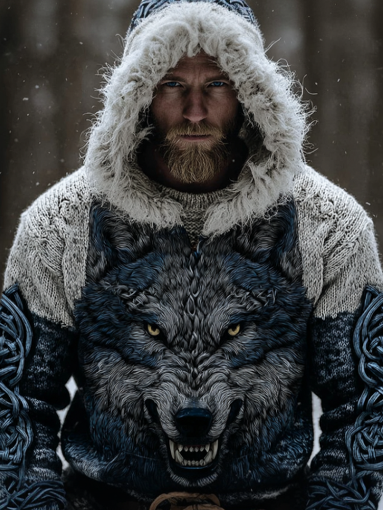 Men's Winter Wolf Retro Viking Style Hooded Knit Sweater