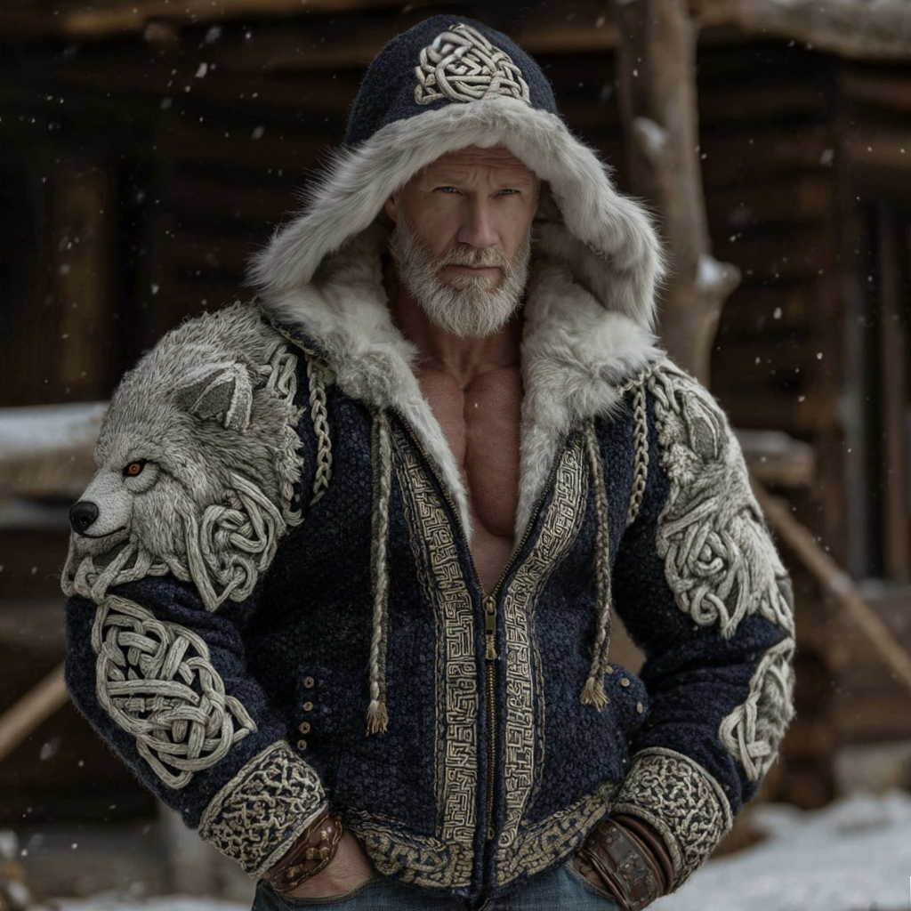 Men's Fuzzy Wolves Viking Celtic Cozy Fur Trim Hooded Cardigan