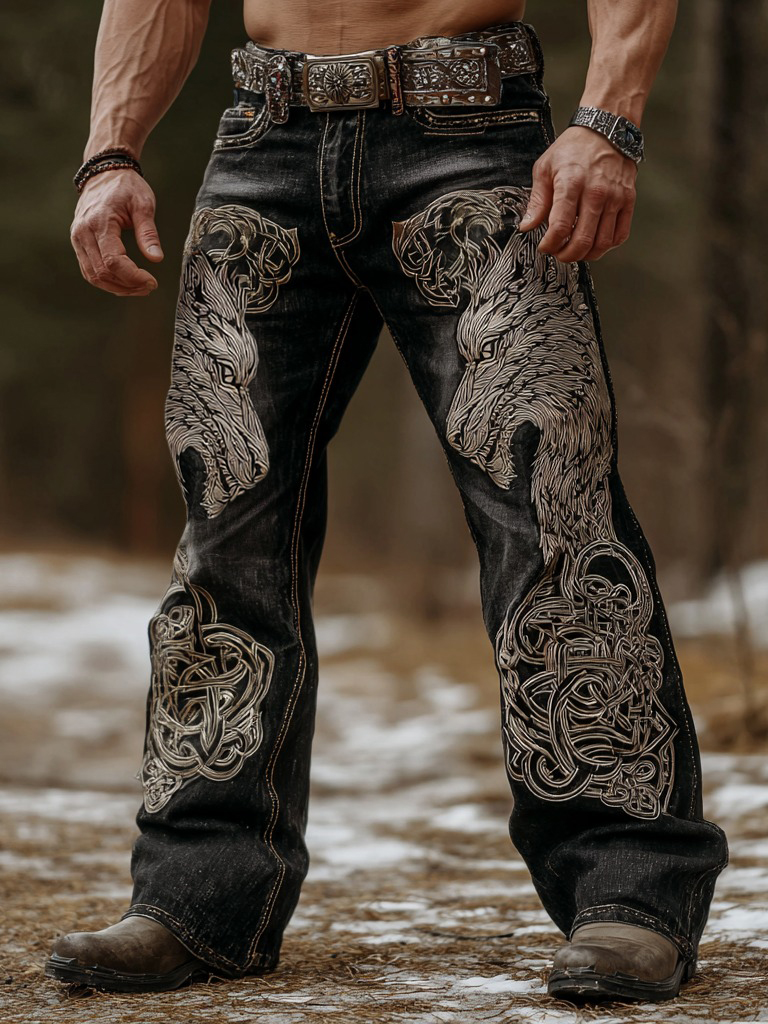 Viking Style Celtic Wolf Art Men's Washed Straight-leg Jeans