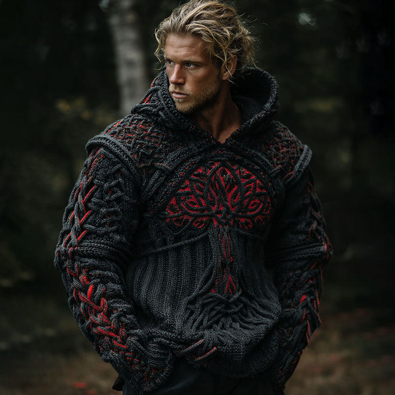 Men's Vintage Viking Celtic Knot Art Chunky Knit Hooded Zip-up Sweater