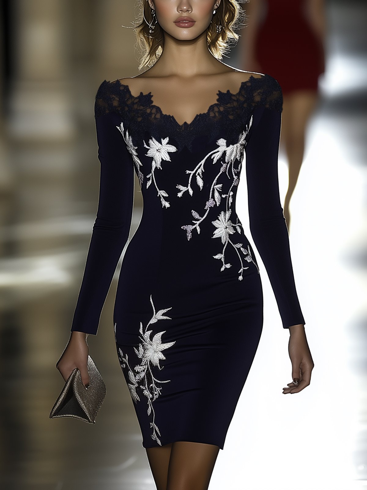 Shipping Black Lace V-Neck Bodycon Dress With Silver Floral Embroidery