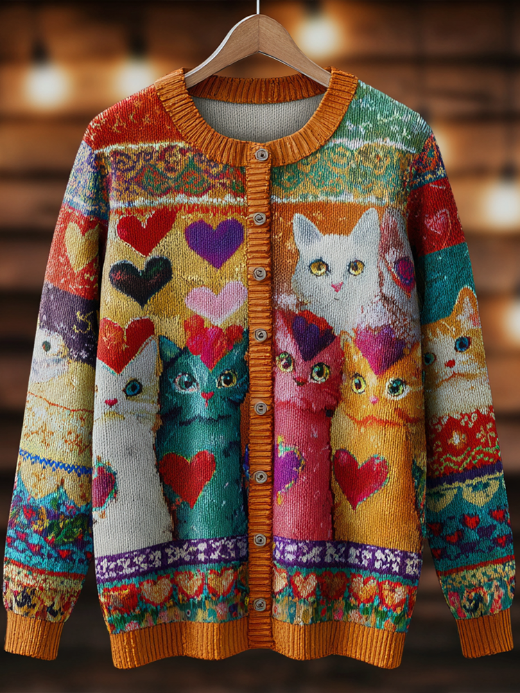 Valentine's Day Fun Cat Pattern Women's Round Neck Knit Sweater Coat