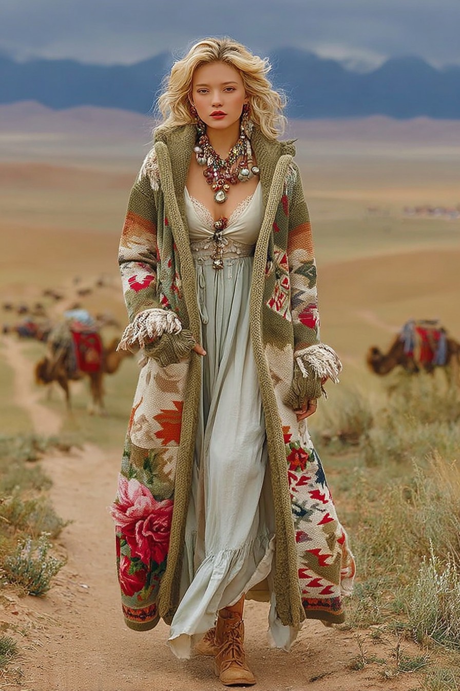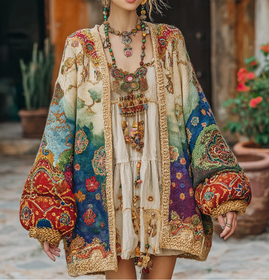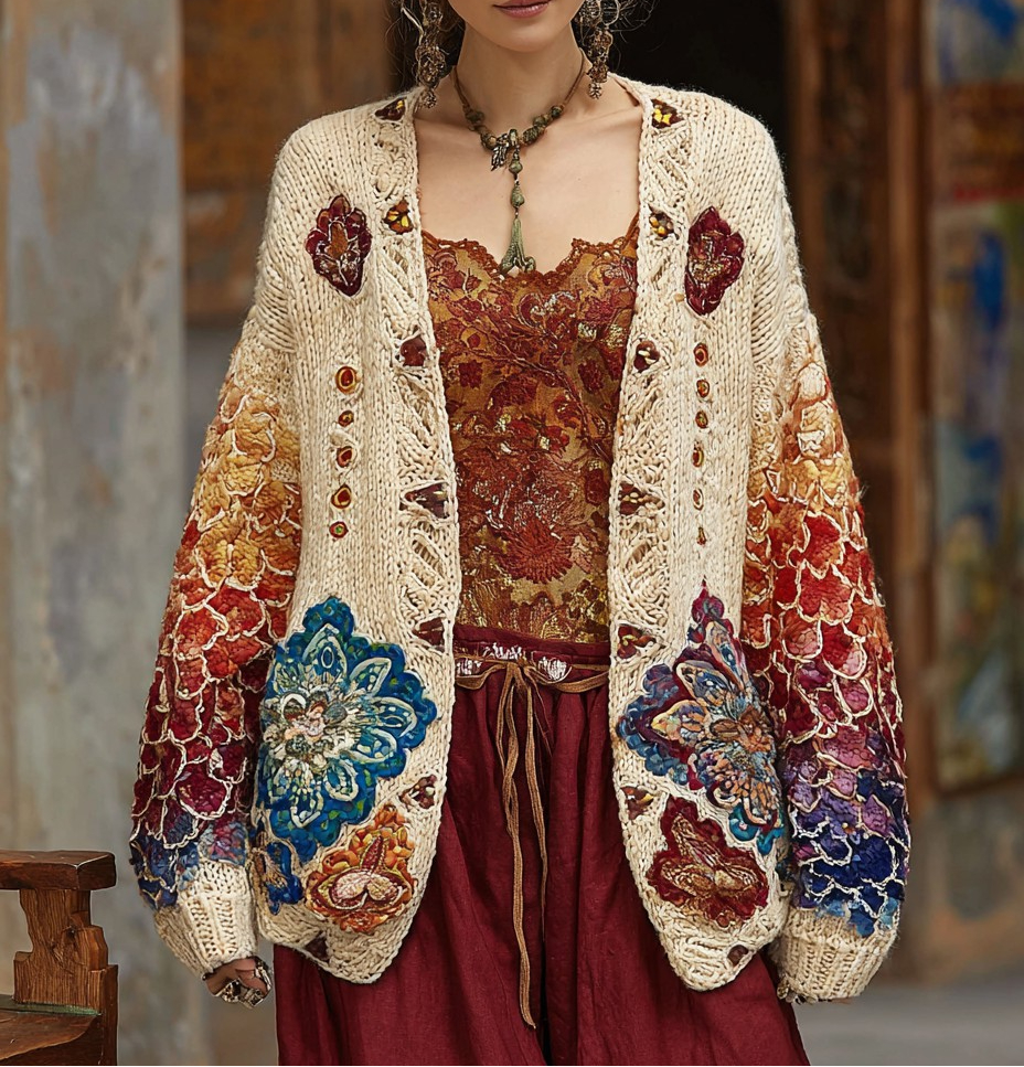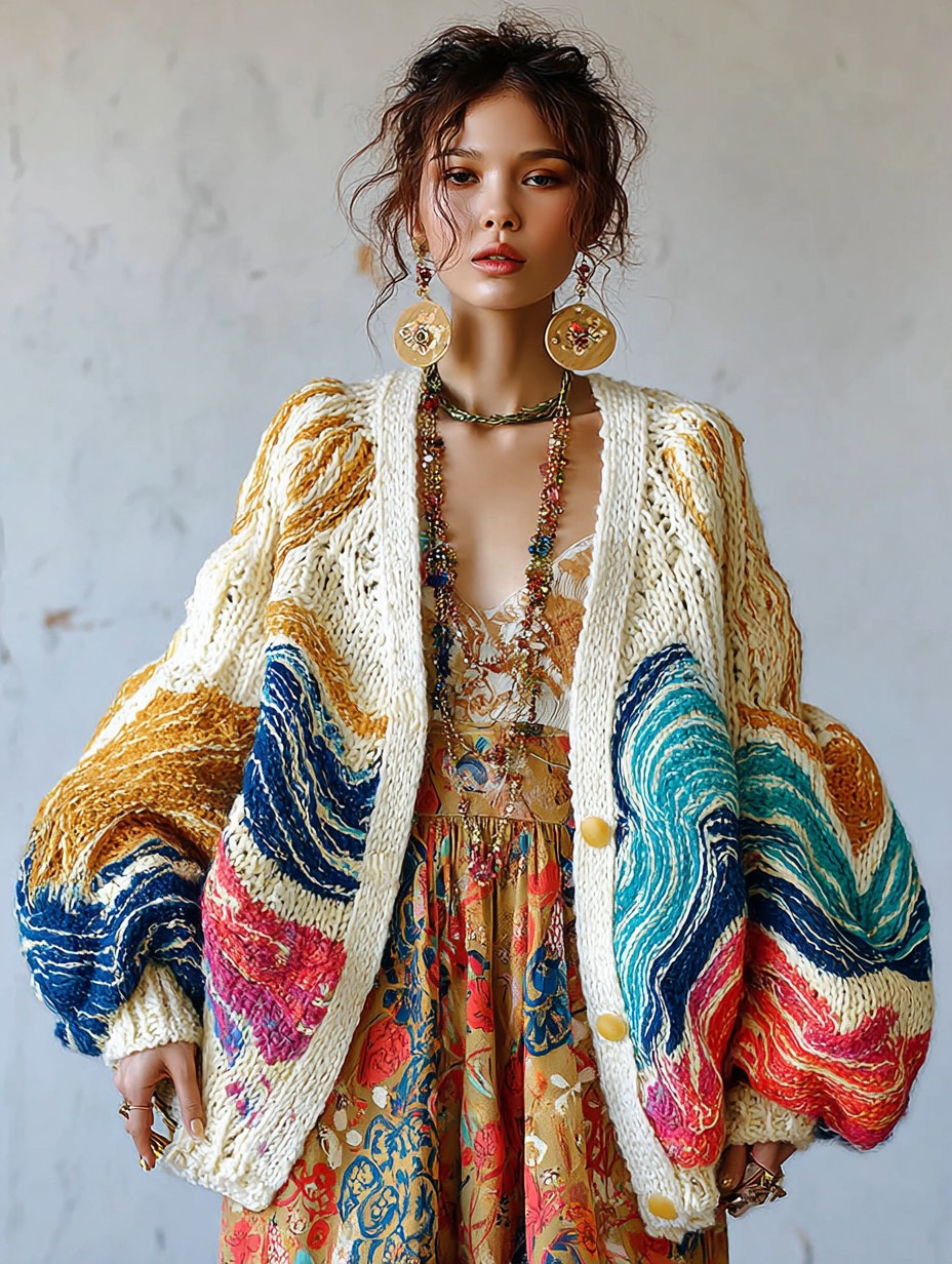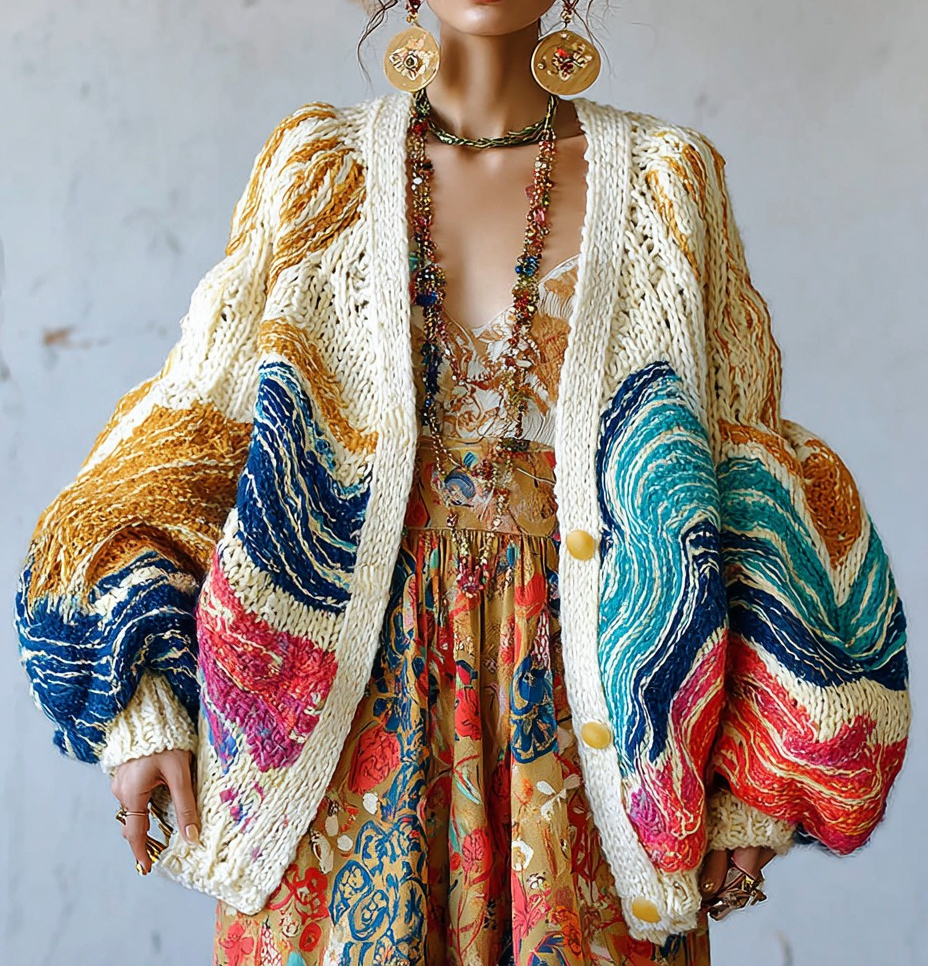 Women's Colorful charm pattern knitted medium and long cardigan