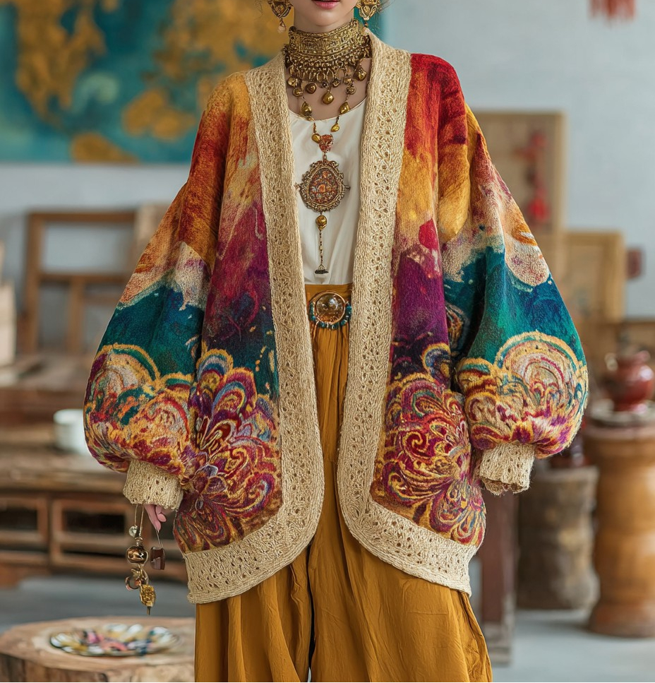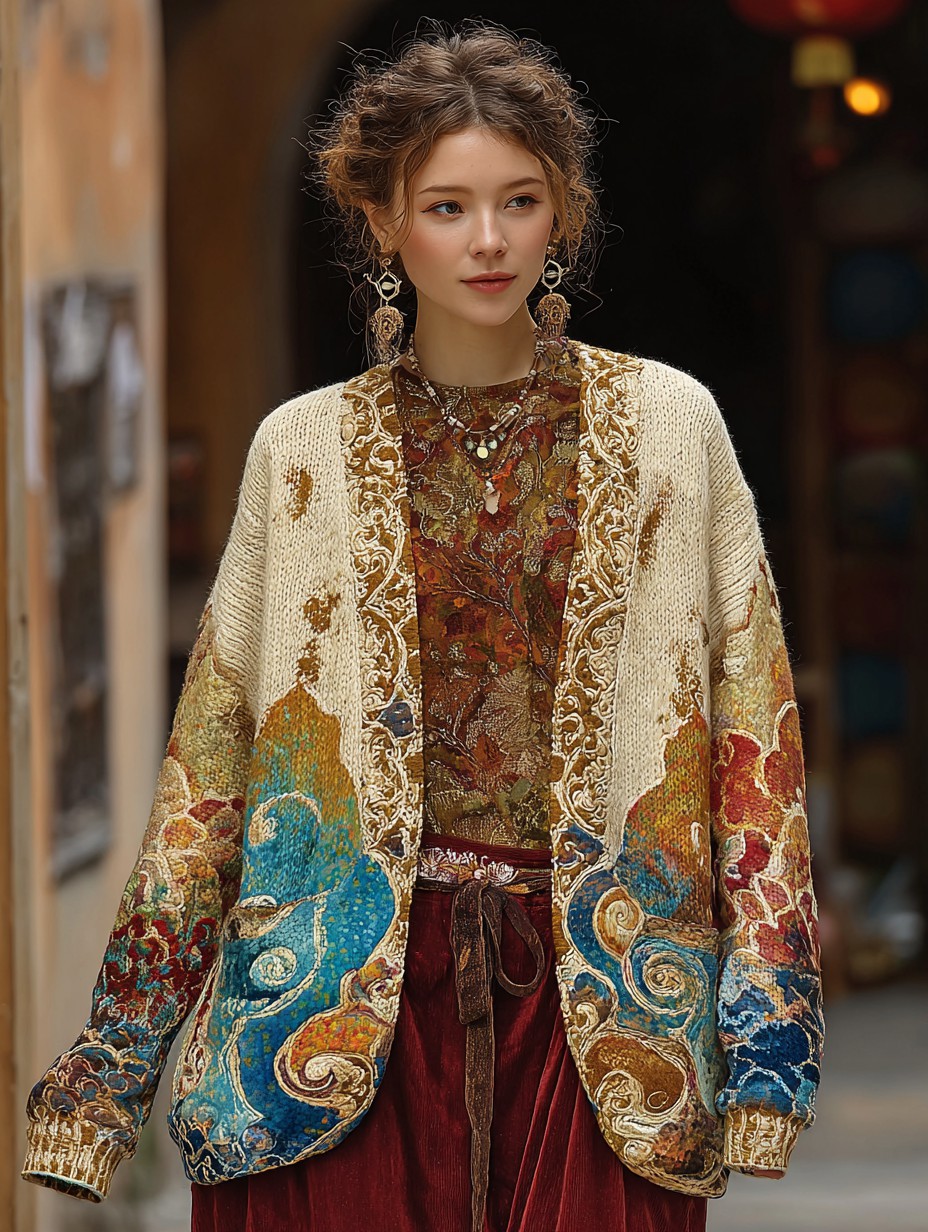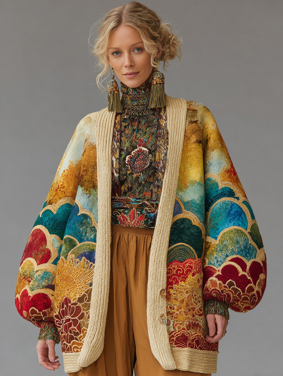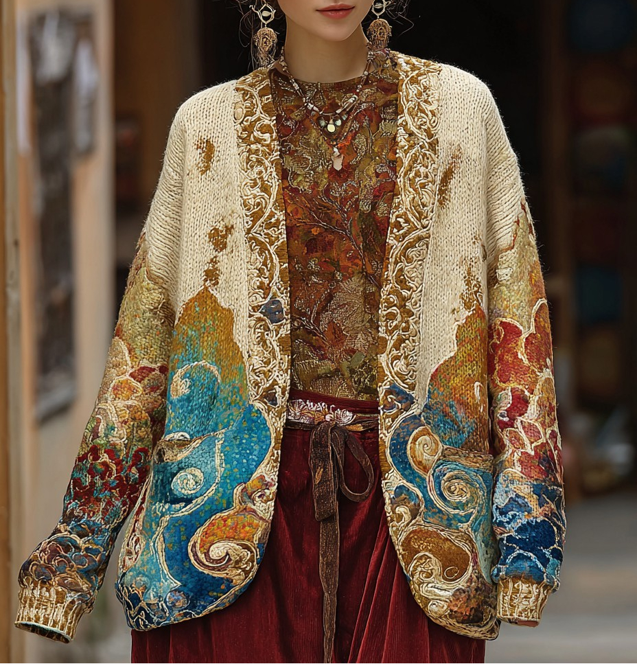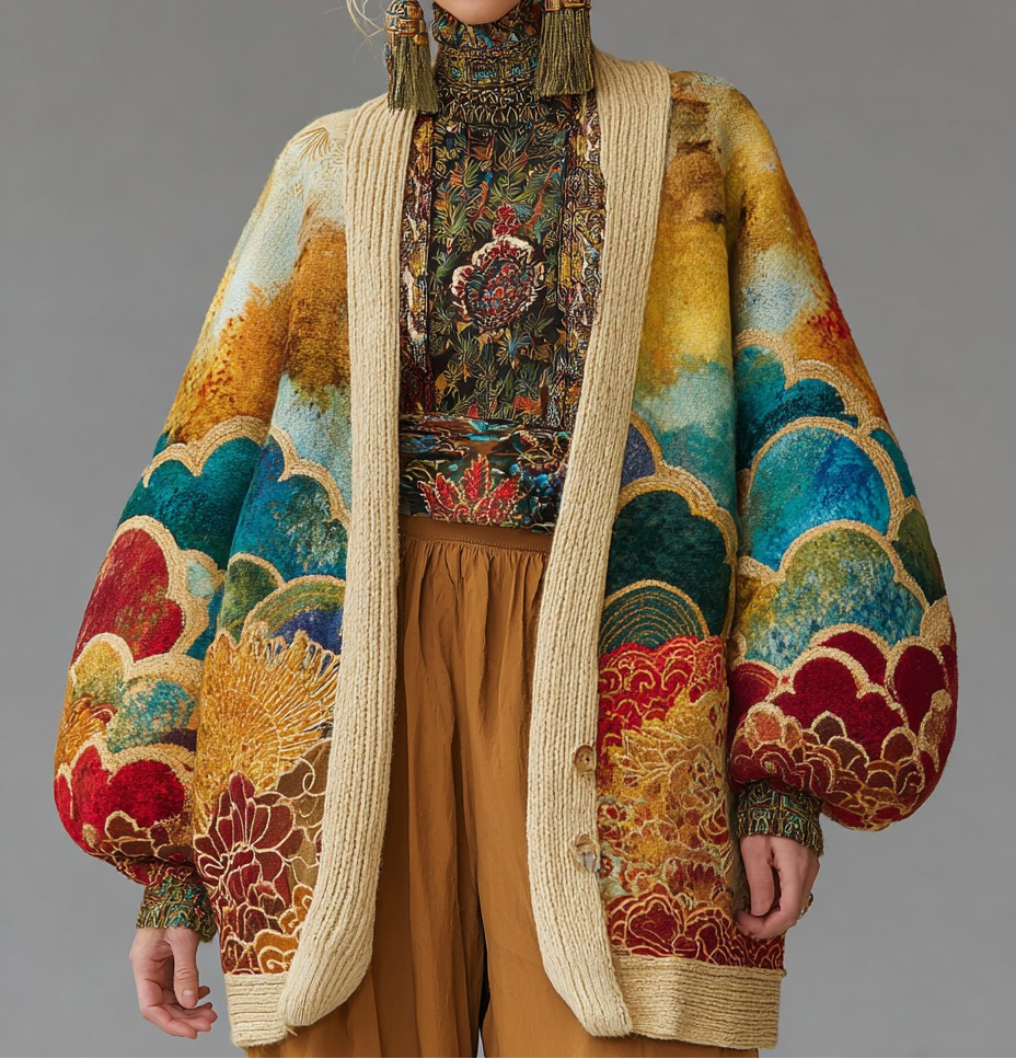 Women's oriental art color scheme long sleeve cardigan