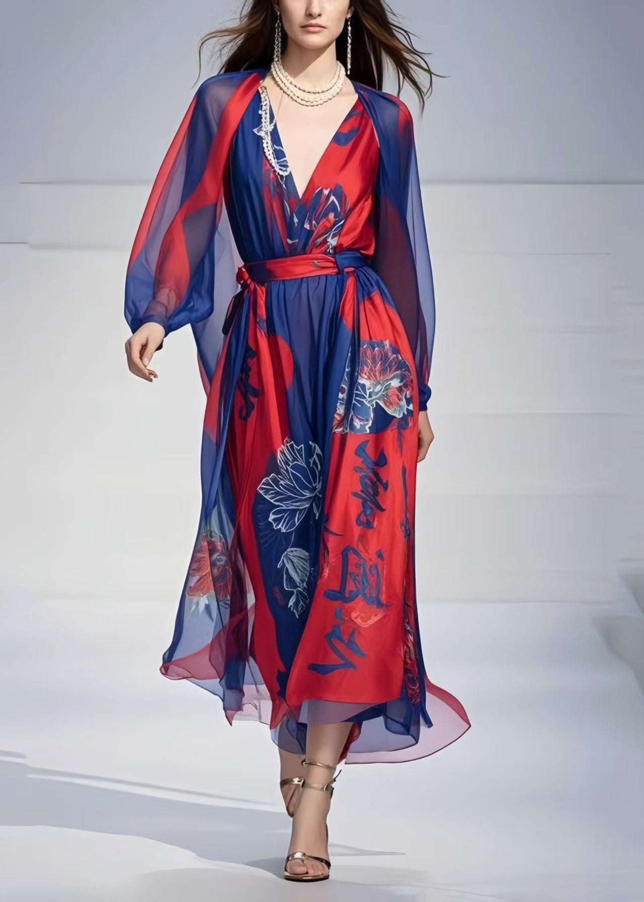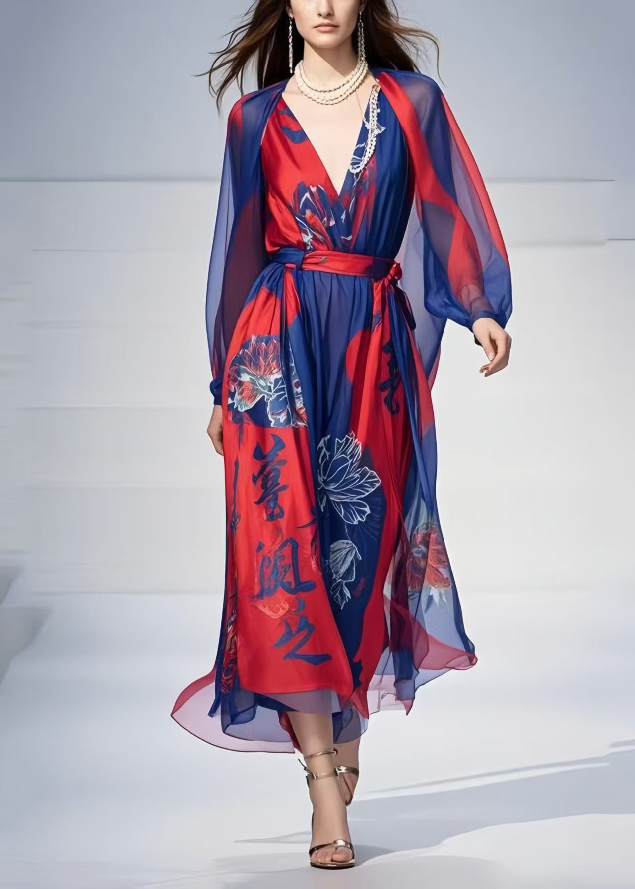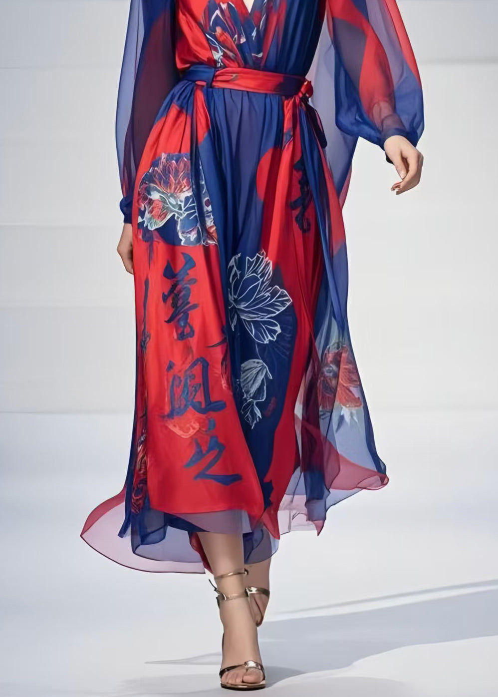Art Navy Cinched Print Chiffon Party Dress Spring