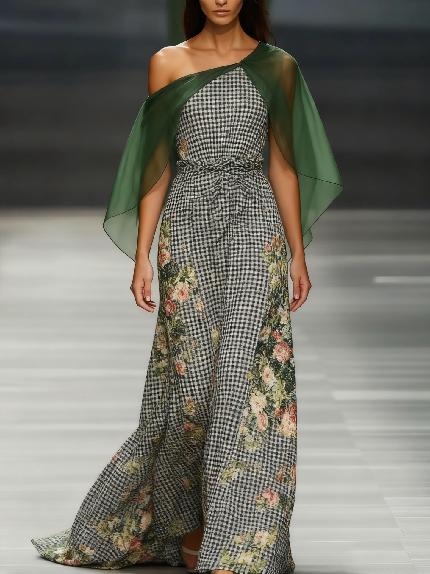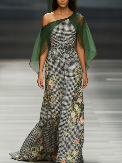 Women's off-the-shoulder long-sleeved green chiffon dress