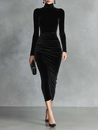 Black Velvet Elegant High-Neck Bodycon Dress