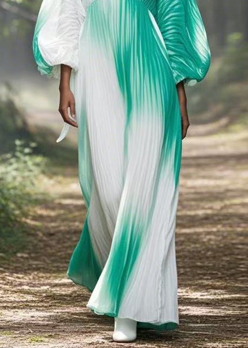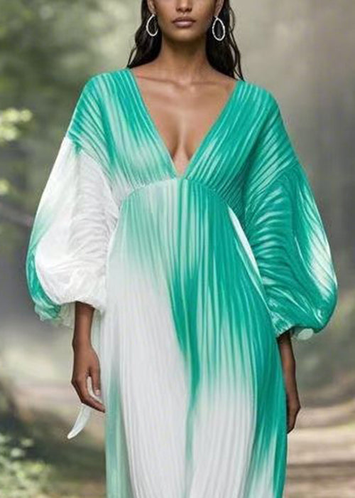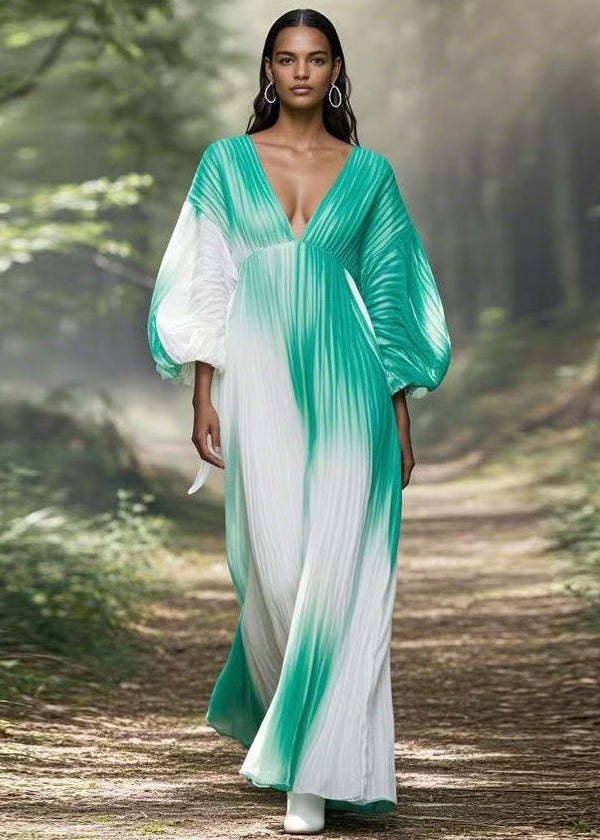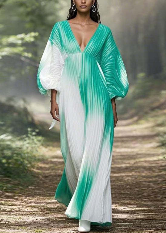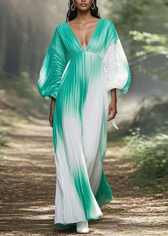 Boho Gradient Color V Neck Wrinkled Chiffon Long Dress Spring