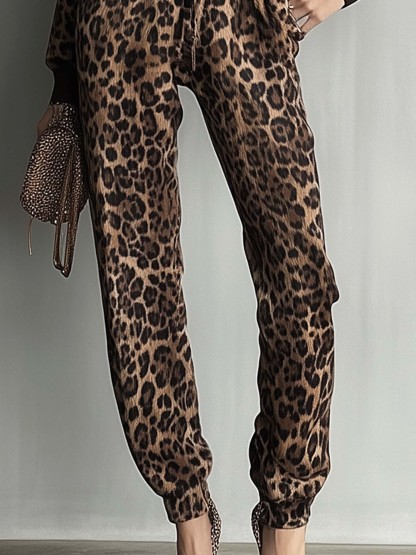 Brown Hooded Sweatshirt Jumpsuit With Leopard Print