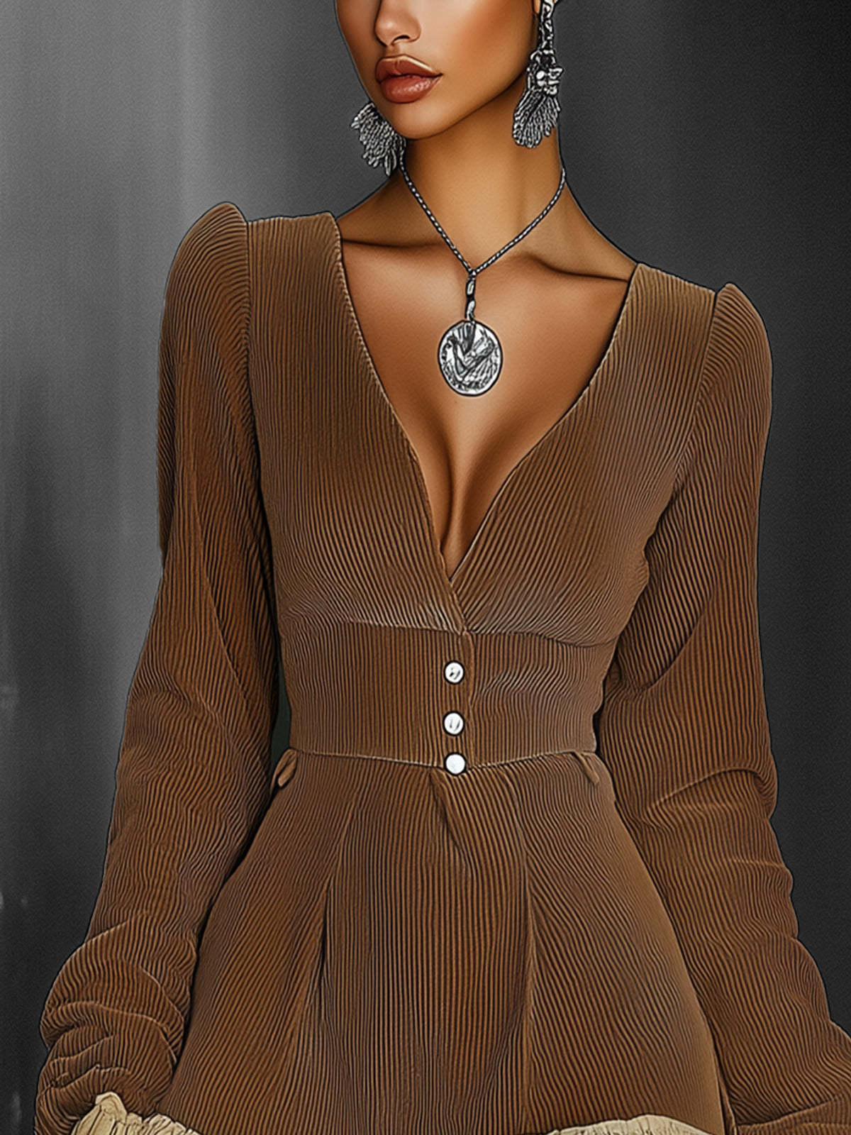 Brown Ruffled Button-Accent Mini Dress