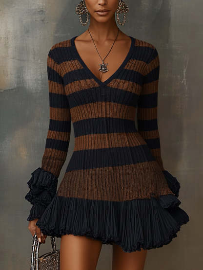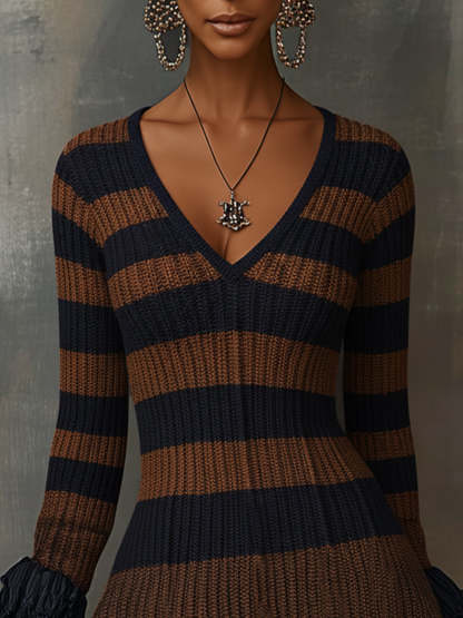 Brown Striped Elegance V-Neck Knit Dress