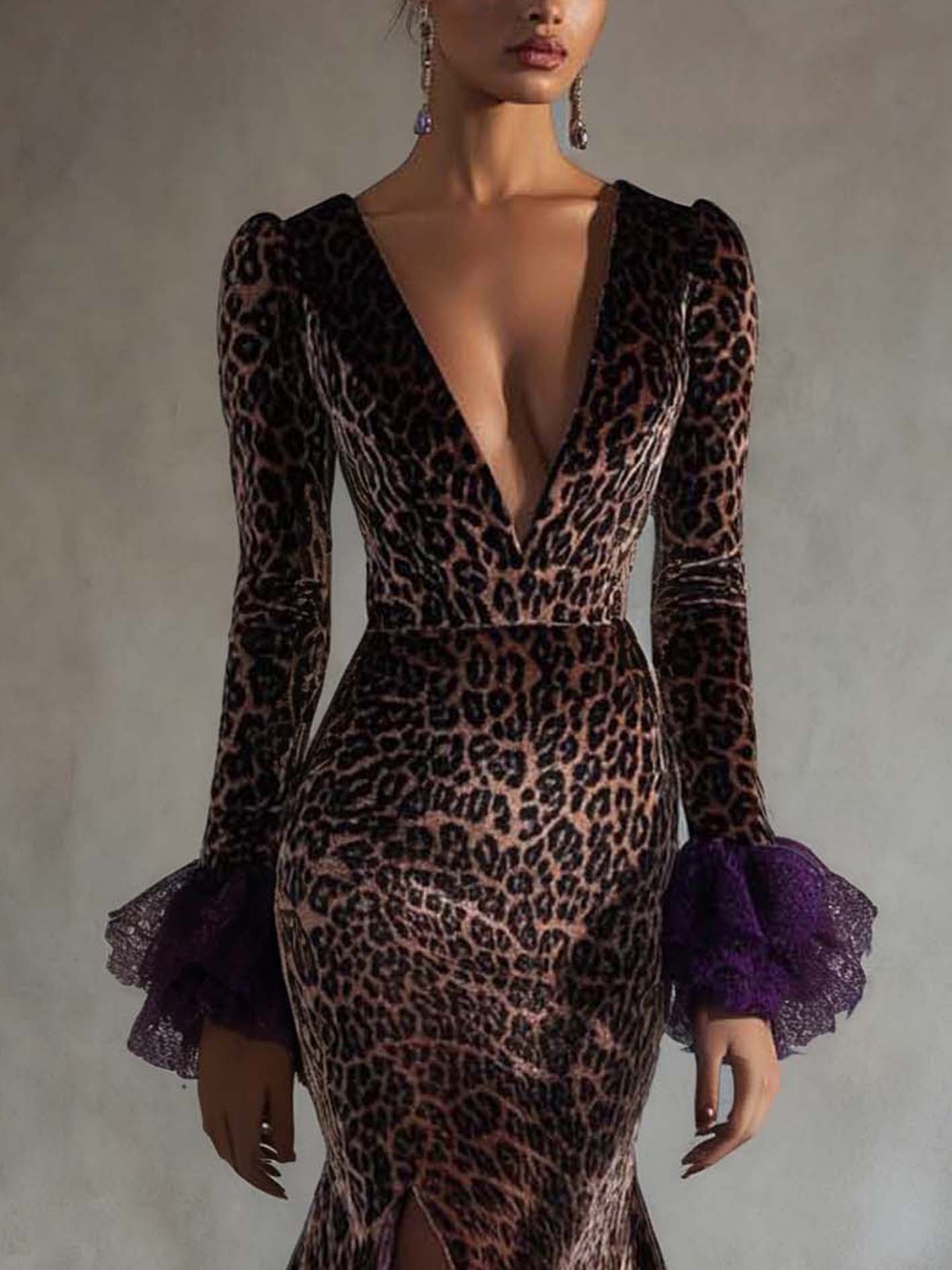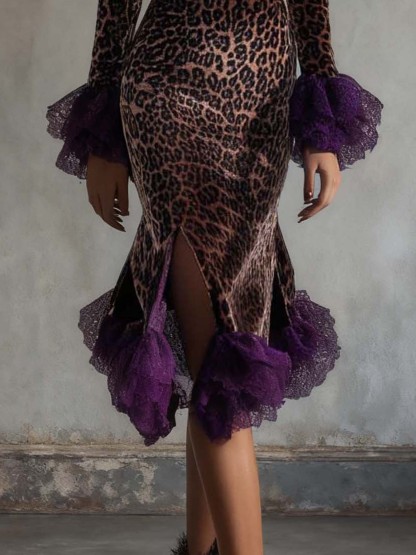 Brown Velvet Bodycon Dress With Purple Lace Ruffles