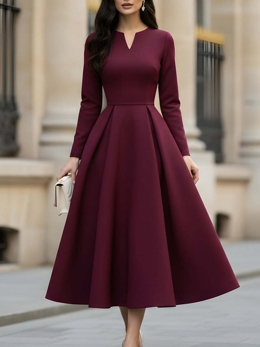 Burgundy V-Neck Pleated Midi Dress