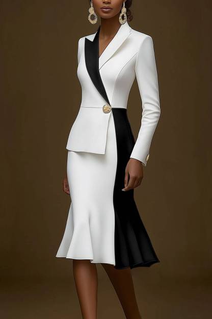 This white and black colorblock work blazer dress features a flattering mermaid silhouette with long sleeves and a midi length, ideal for professional settings and business events. The colorblock design adds a modern twist to the classic blazer dress, offering both elegance and style. Crafted from comfortable fabric, it ensures all-day wearability. Pair with heels for a polished and confident office outfit.