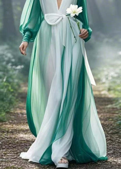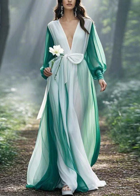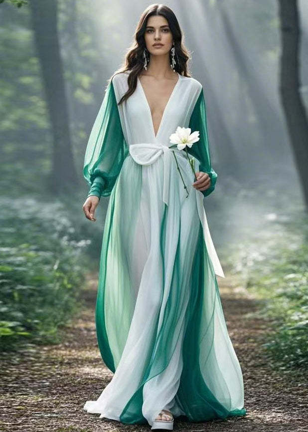 Chic Colorblock V Neck Tie Waist Chiffon Maxi Dresses Spring