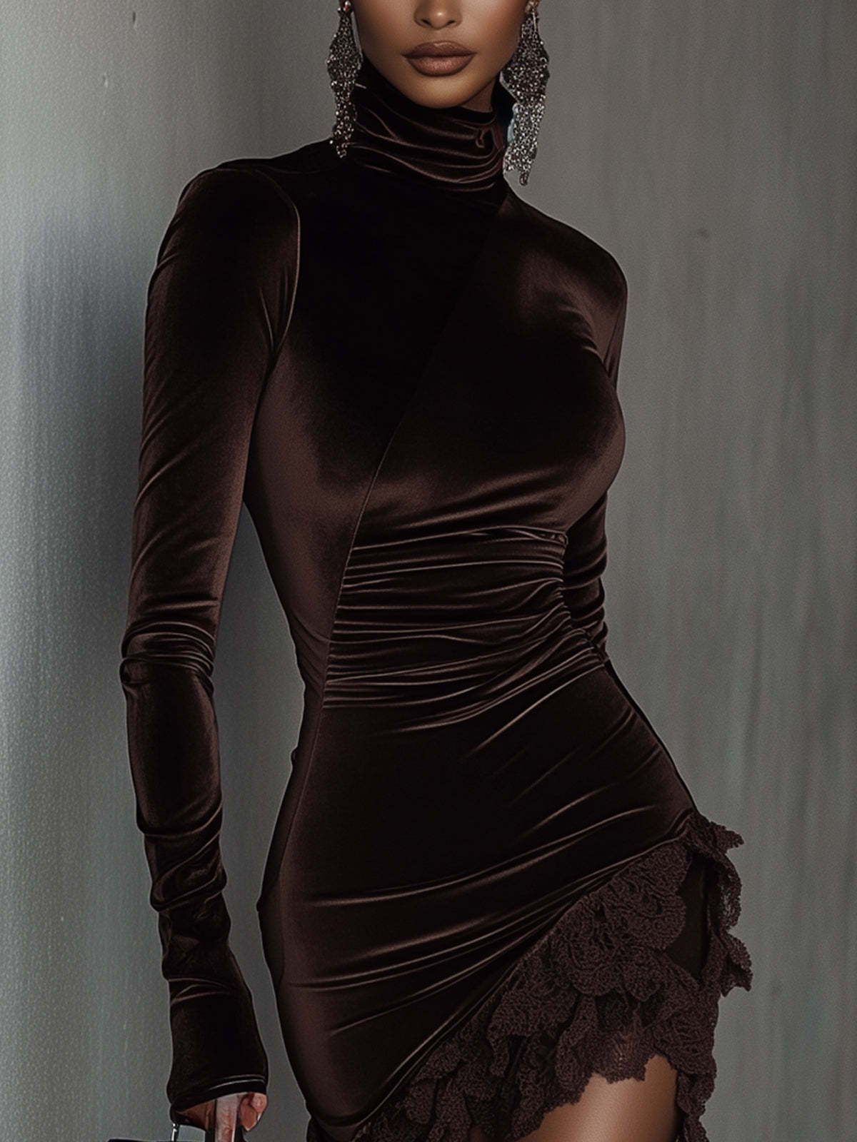 Chocolate Velvet Turtleneck Lace Hem Bodycon Dress