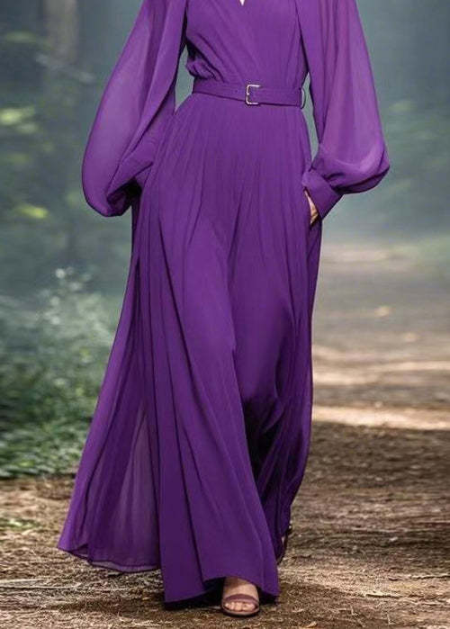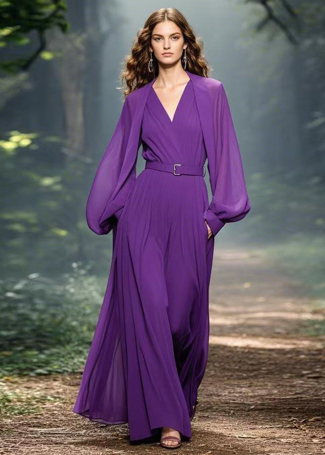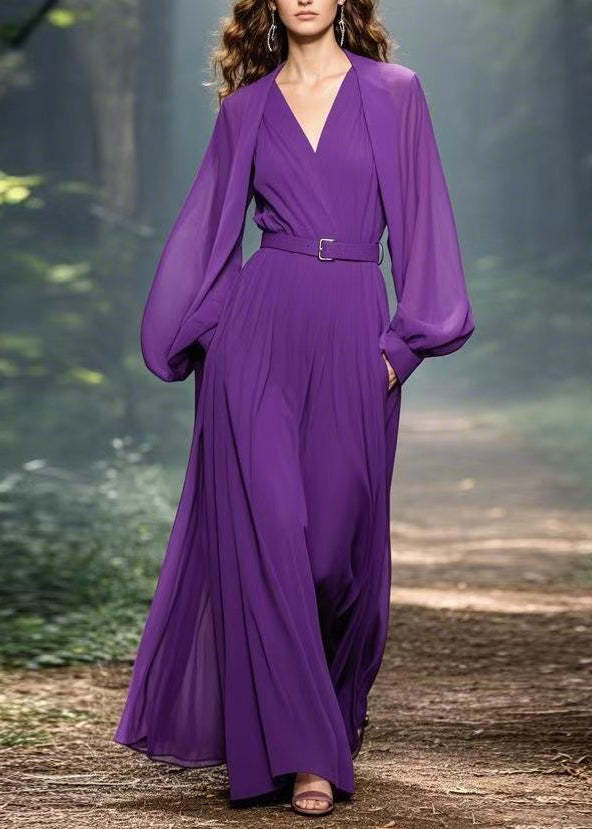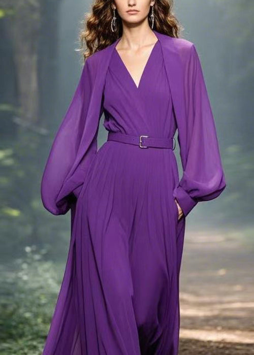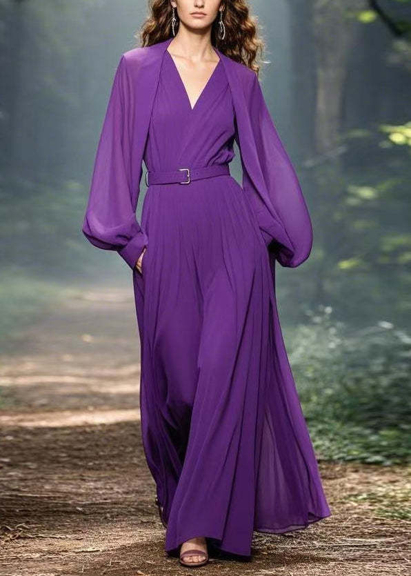 Classy Purple V Neck Pockets Patchwork Chiffon Maxi Dress Spring