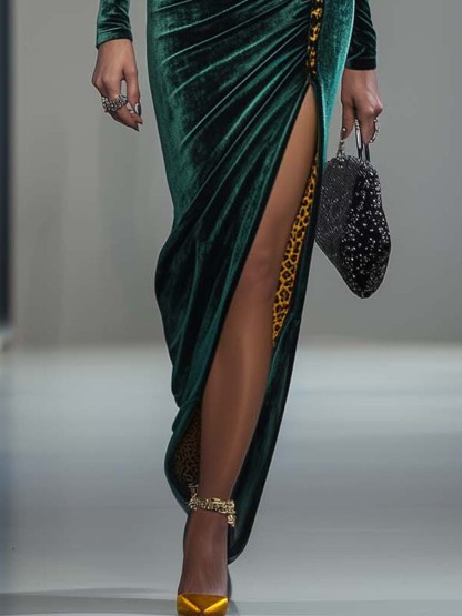 Dark Green Velvet Front Slit Bodycon Dress With Yellow Leopard Print