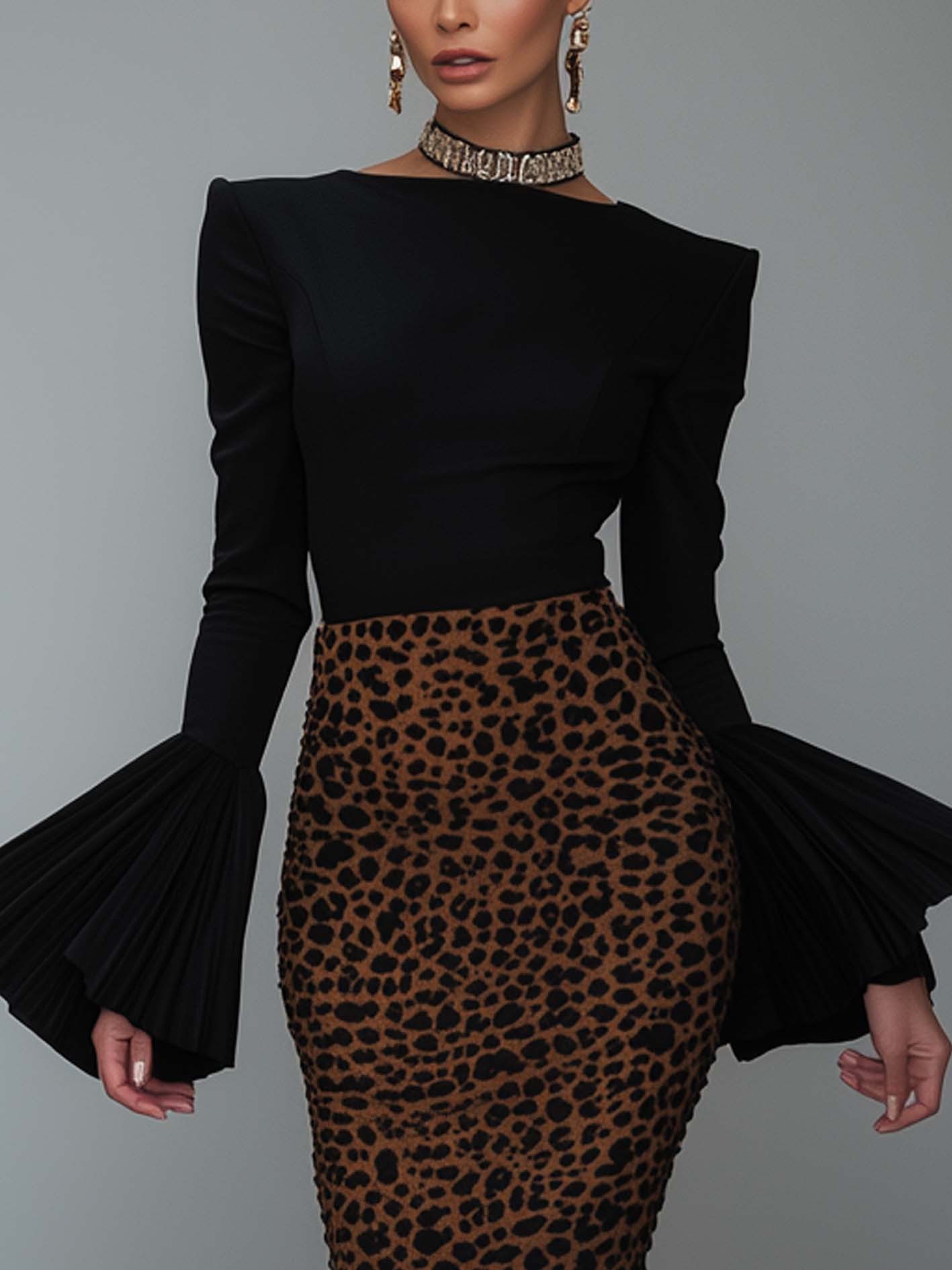 Elegant Black Bodycon Dress With Flared Sleeves And Leopard Print