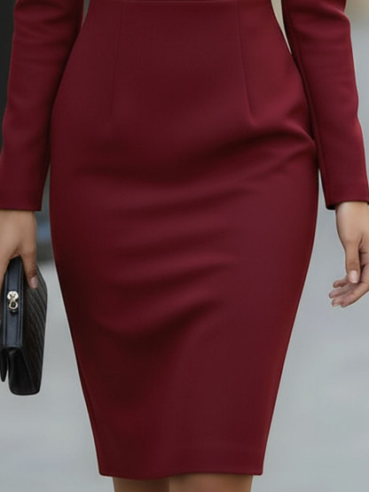 Elegant Burgundy Mock Neck Sheath Dress With Puff Sleeves