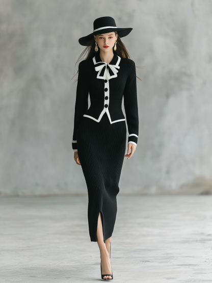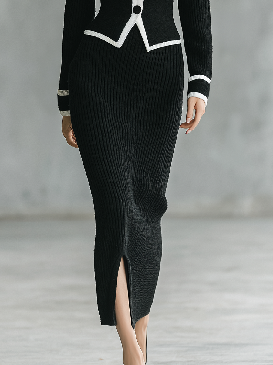 Elegant Retro Color-blocked Knit Cardigan And Skirt Set