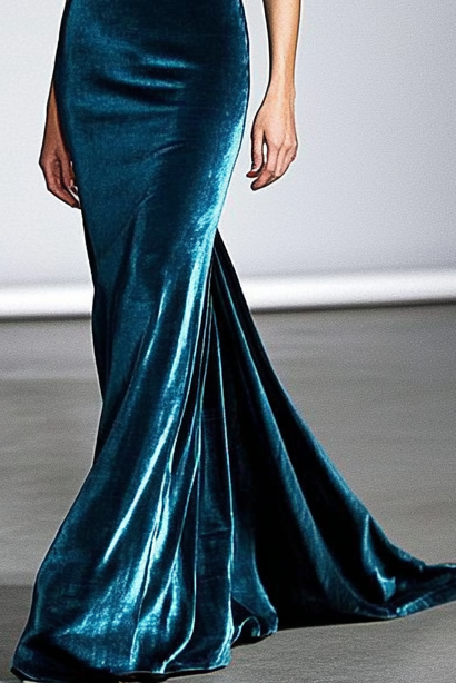 This elegant dark blue fishtail maxi dress exudes sophistication with a deep velvet finish. Featuring a V-neck crossover bodice and delicate waist ruching, it’s the perfect choice for formal parties, creating a graceful silhouette with timeless appeal.