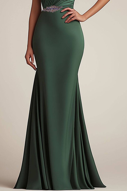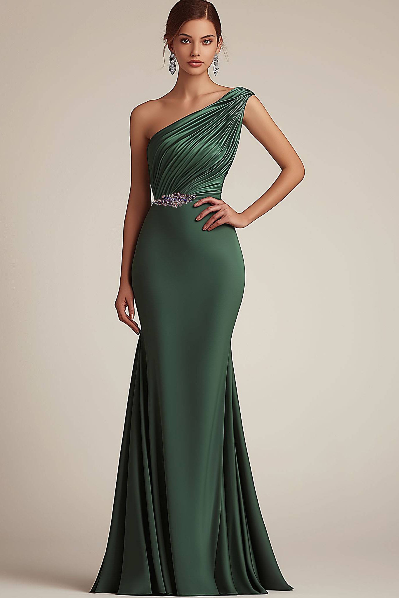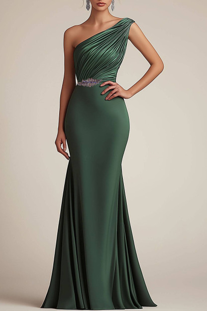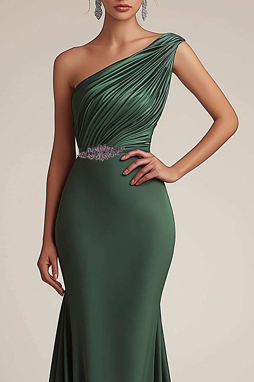 Formal Evening Dress Green One Shoulder Pleated Mermaid Maxi Gown