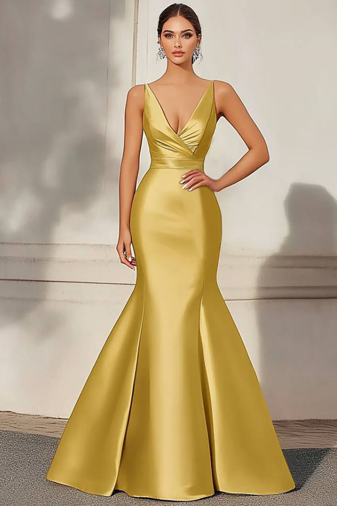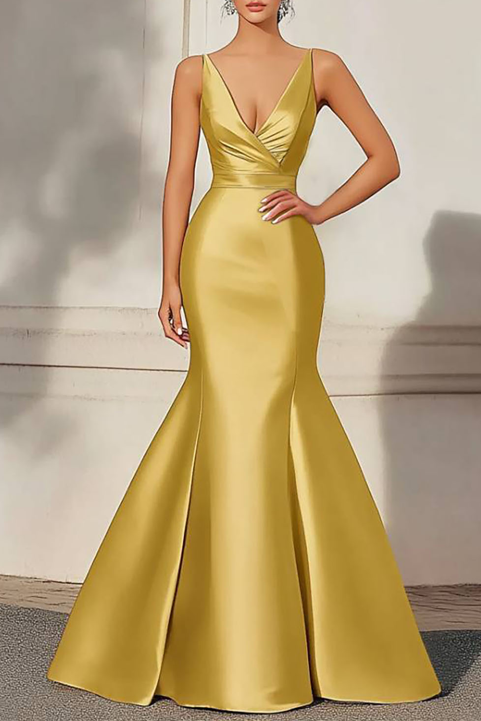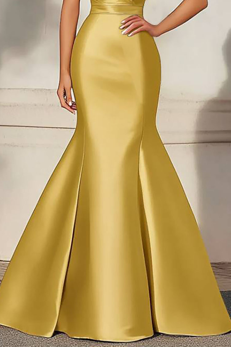 Formal Evening Dress Yellow Satin Deep V Mermaid Maxi Gown