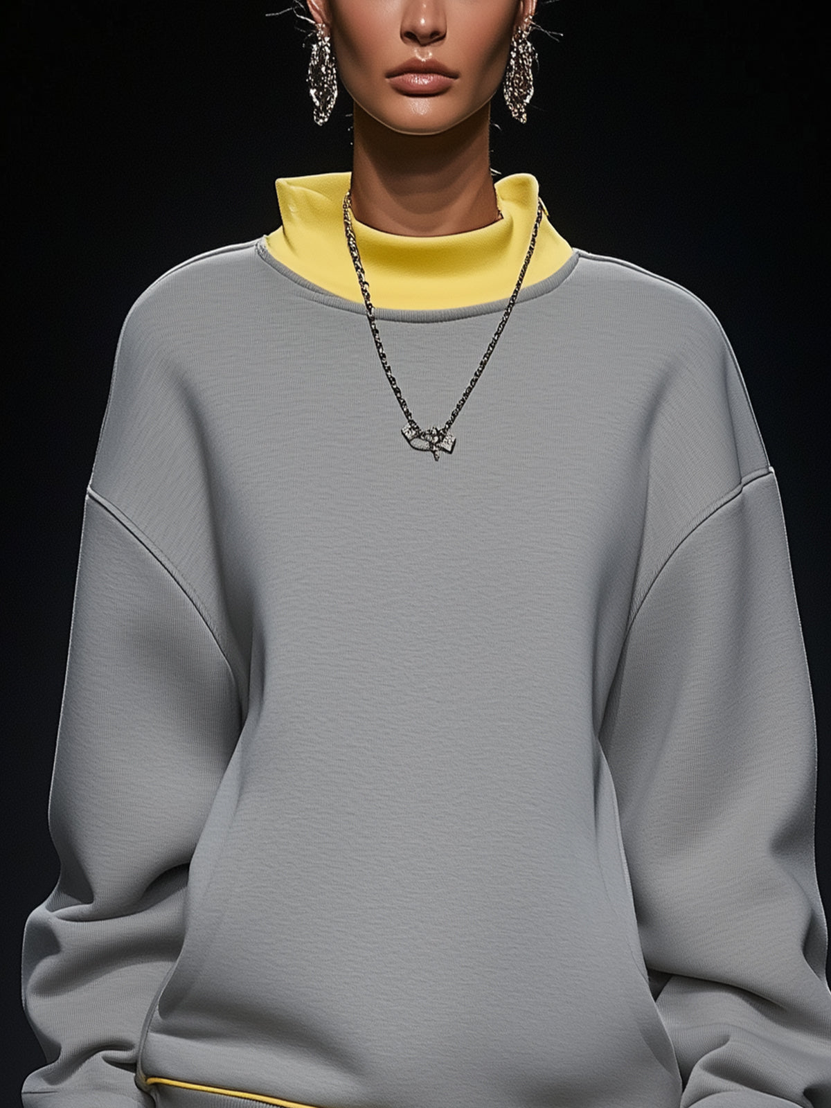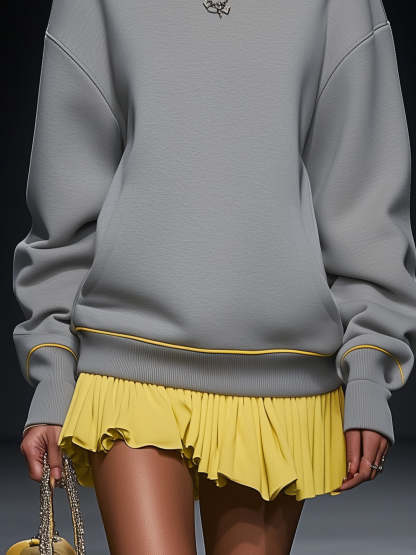 Gray Turtleneck Mini Casual Dress With Yellow Trim And Hem