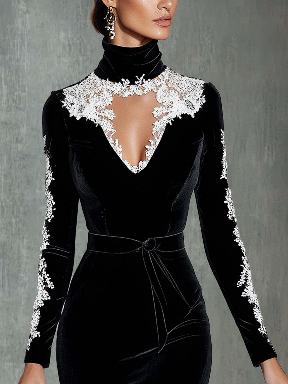 Lace-trimmed Velvet Midi Dress With Embroidered Sleeves
