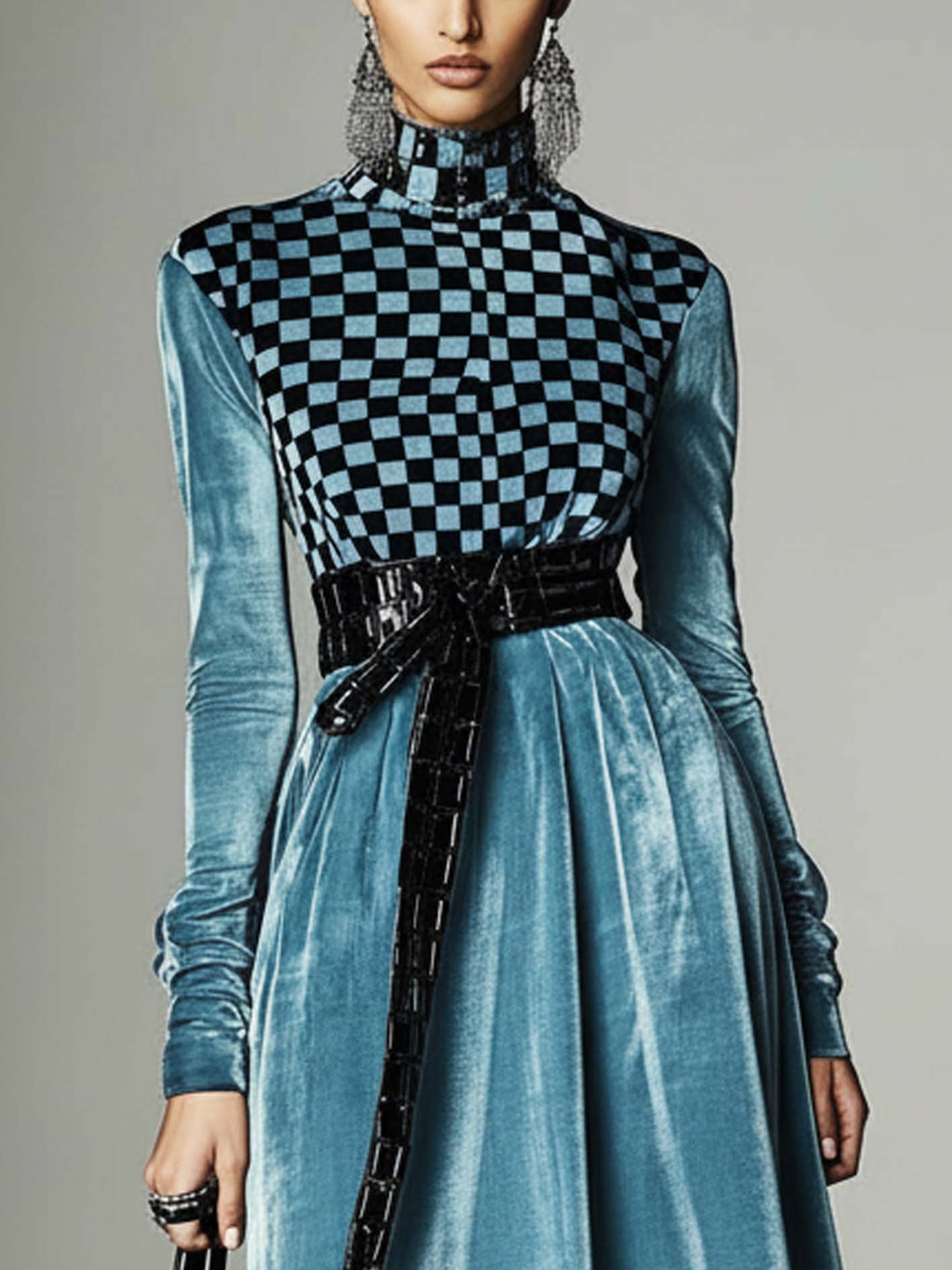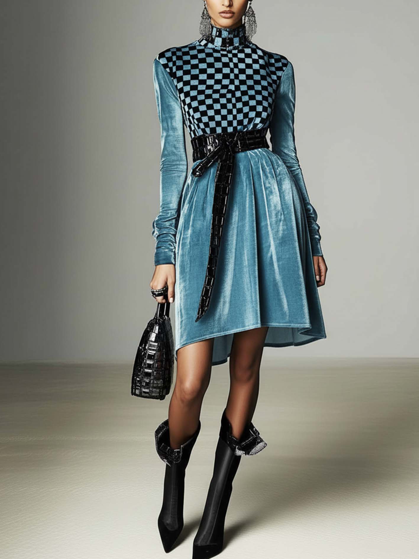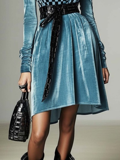 Light Blue Velvet Midi Dress With Black Plaid And Belt