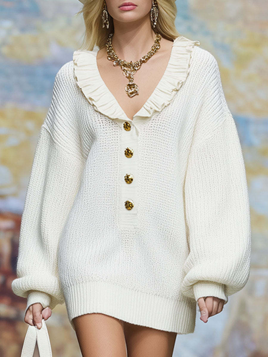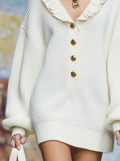 Loose-fitting V-neck Button-down Knit Mini Dress