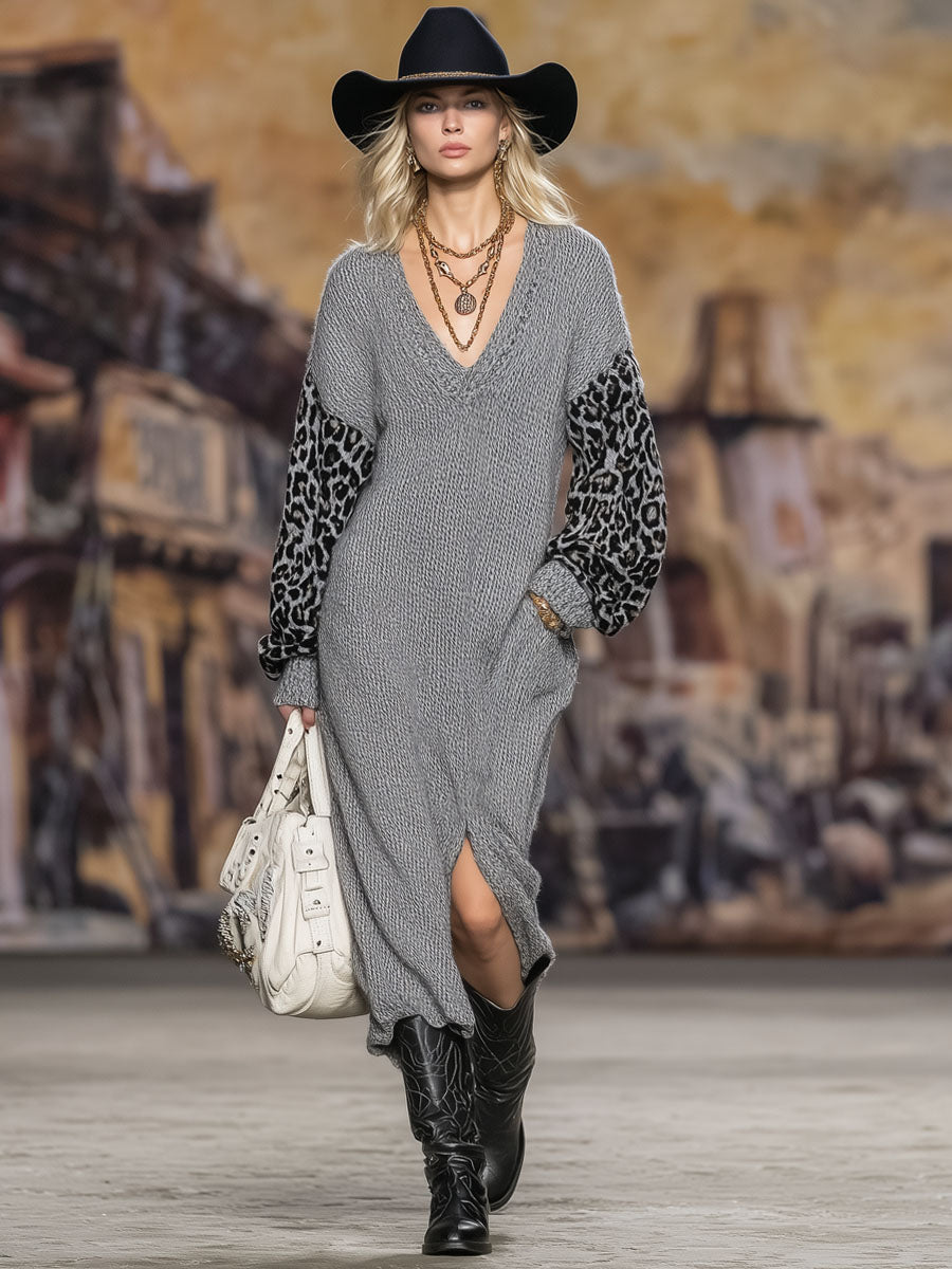 Loose-fitting V-neck Leopard Print Long-sleeved Split Knit Maxi Dress