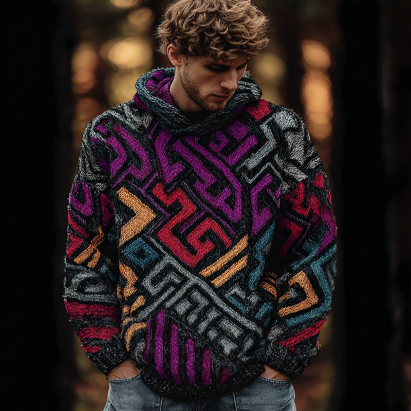 Men's Retro Geometric Line Embroidered Hooded Sweater