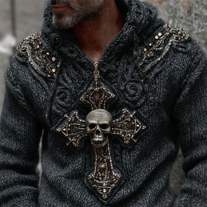 Men's Skull Cross Studded Celtic Cozy Chunky Hooded Sweater