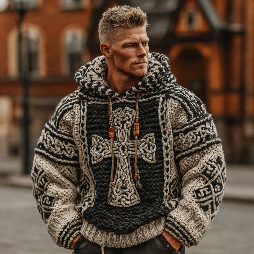 Men's Viking Celtic Cross Knot Knit Hooded Sweater
