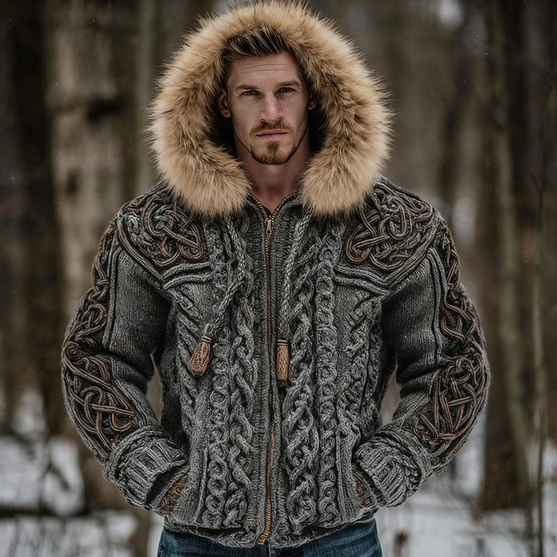 Men's Viking Celtic Knot Art Chunky Knit Fur Collar Hooded Zipper Cardigan