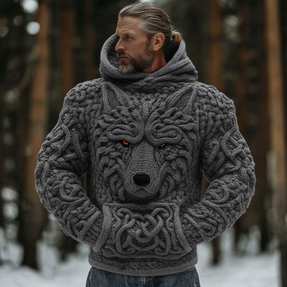 Men's Viking Celtic Knot Wolf Head Embroidered Thick Warm Hooded Sweater