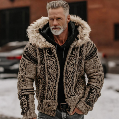Men's Viking Celtic Style Cozy Fur Collar Hooded Sweater Jacket