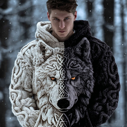 Men's Viking Celtic Wolf Knit Contrast Chunky Hooded Sweater