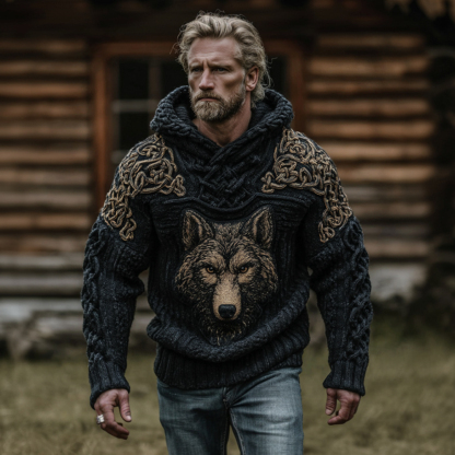 Men's Viking Style Celtic Knot Wolf Totem Contrasting Thick Hooded Sweater