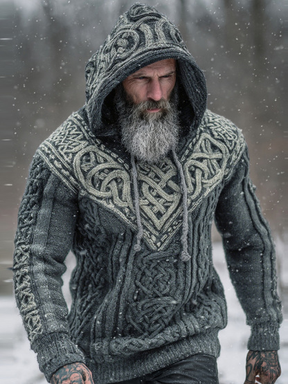Men's Viking Tribal Jacquard Celtic Knotwork Inspired Chunky Knit Hooded Sweater