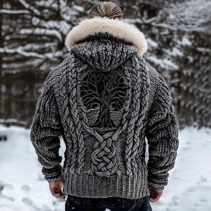 Men's Viking Tribal Tree Of Life Celtic Chunky Knit Fuzzy Hooded Zipper Cardigan