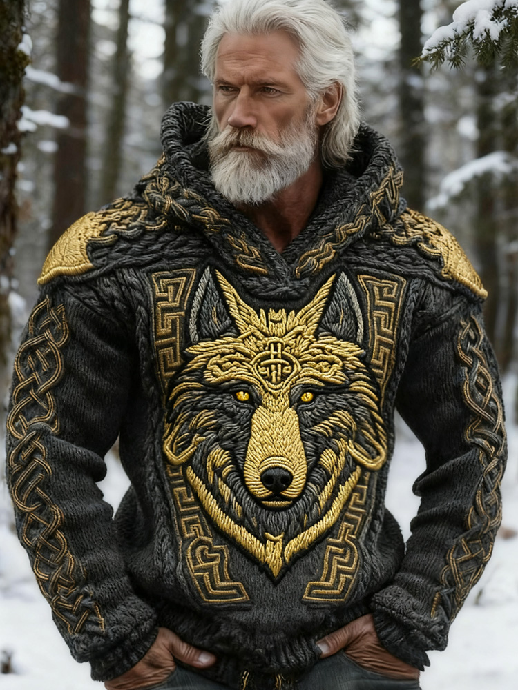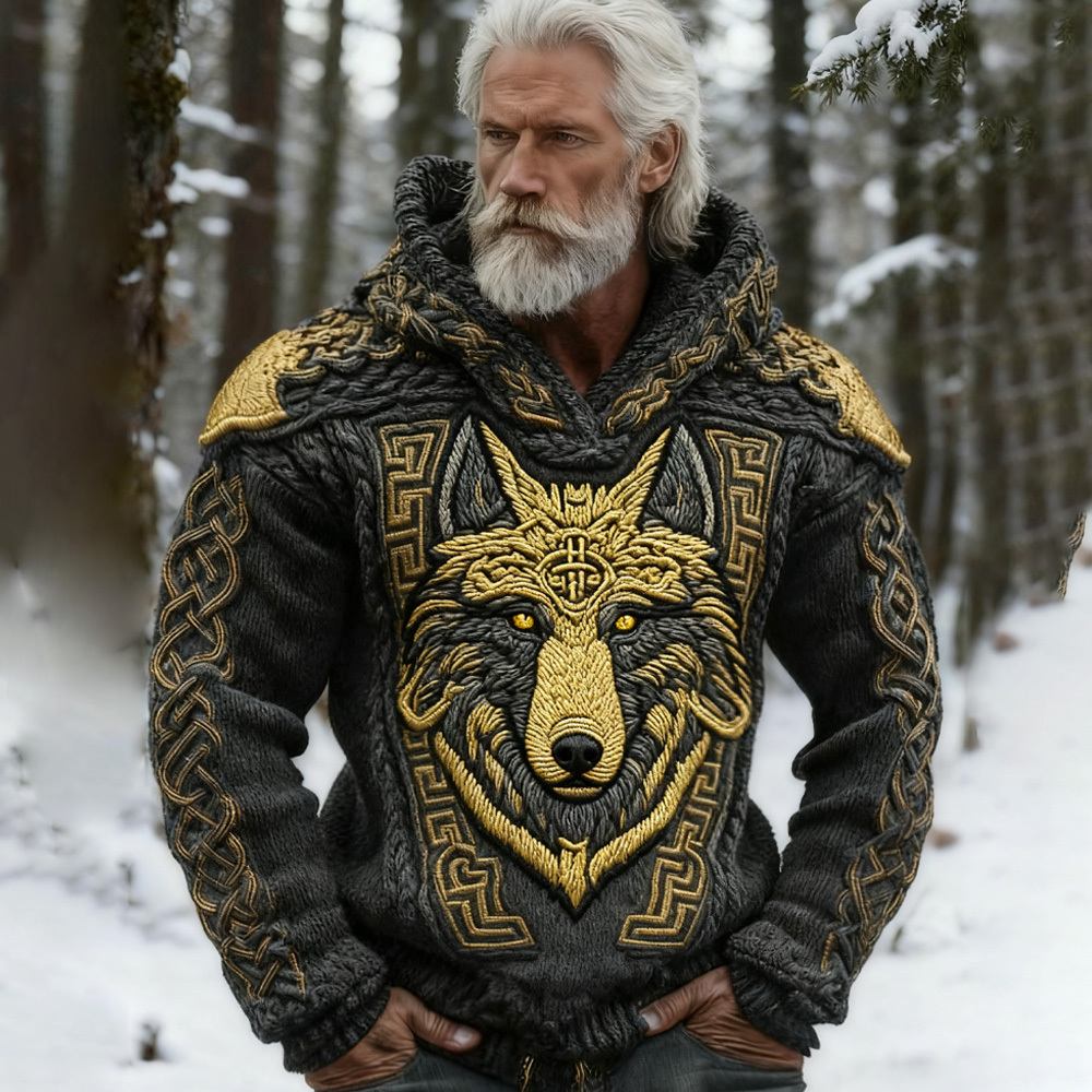 Men's Viking Wolf Celtic Knot Jacquard Knitted Hooded Sweater