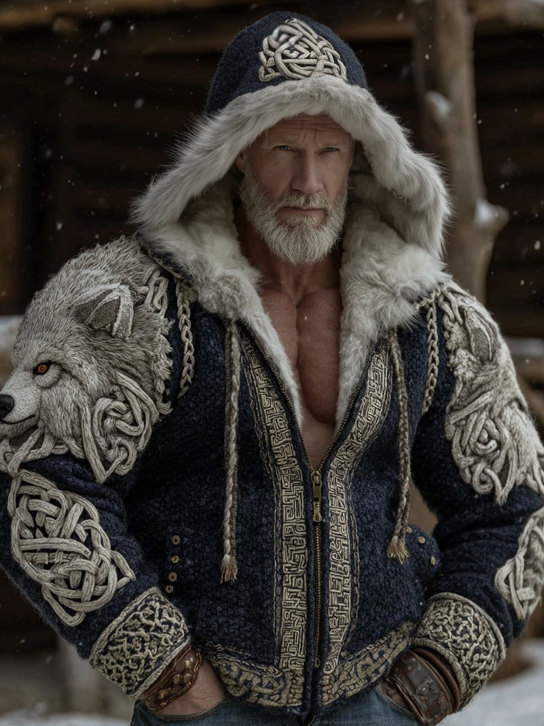 Men's Viking Wolf Style Celtic Vintage Art Cozy Fur Collar Knit Hooded Sweater Jacket
