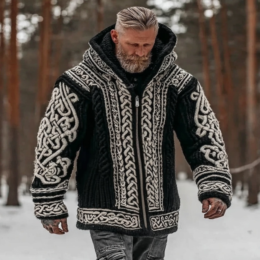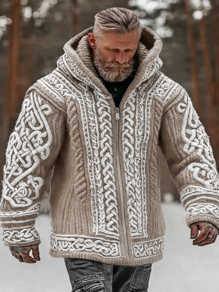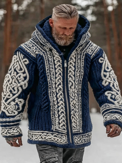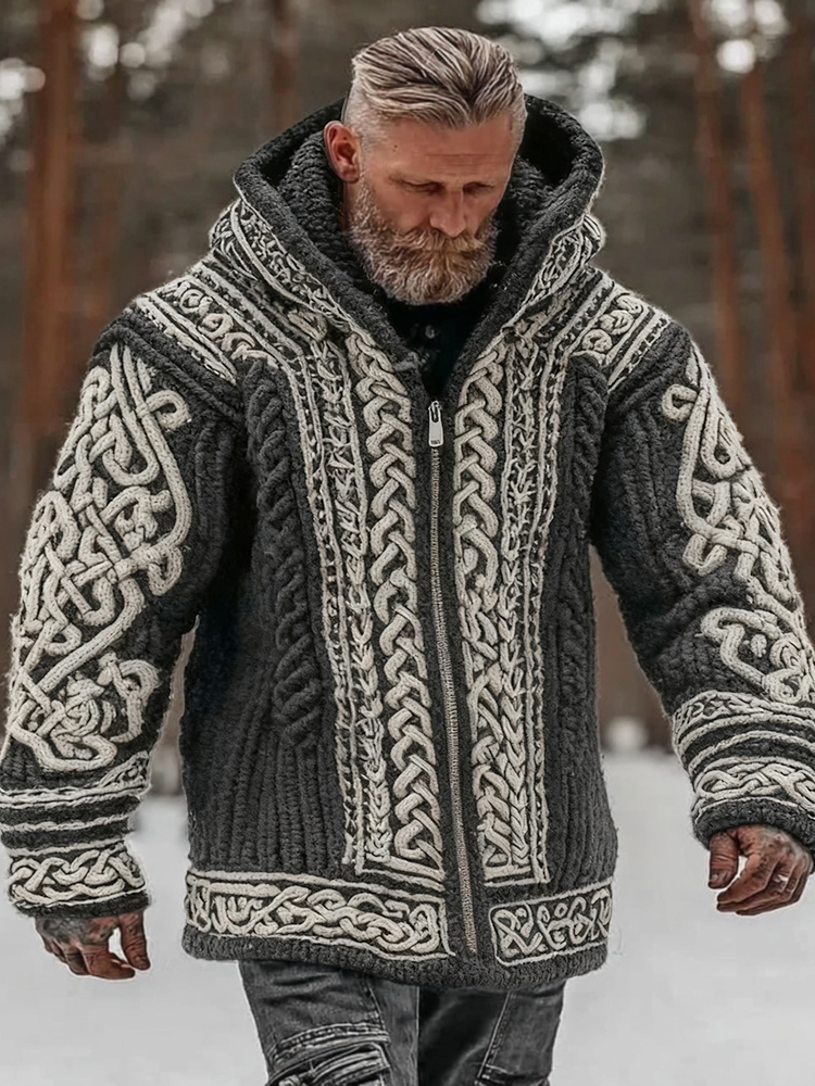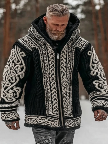 Men's Vintage Viking Celtic Knot Art Chunky Knit Hooded Zip-up Sweater