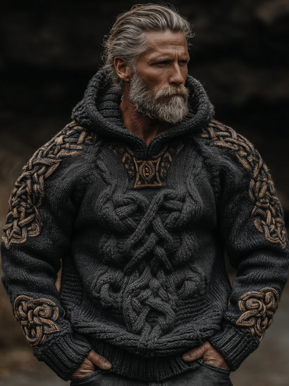 Men's Vintage Viking Celtic Knot Art Knit Hooded Sweater